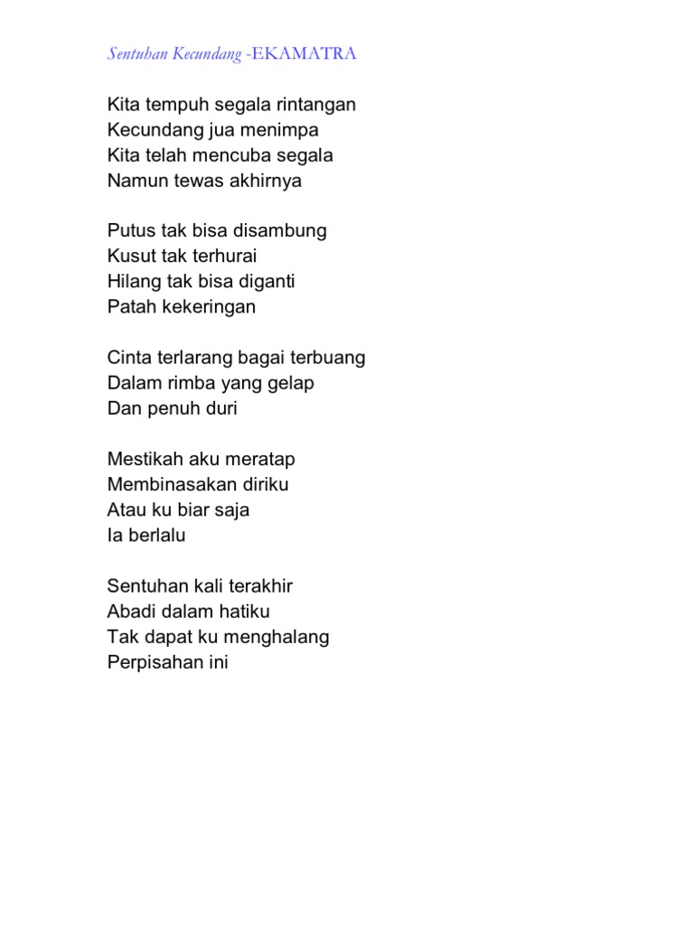 The things You love and do what you would do. Tabahkanlah dirimu kasih menempuh hidup ini fitnah dan dengki selalu kan mengiringi tetapkanlah hatimu kasih menempuh hidup ini jangan kau bersedih jangan berputus asa di. Berikut cuplikan syair nyanyian teks dari lagunya.
